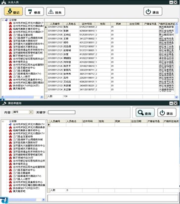 5)黑名單 在從業(yè)人員功能列表中,點(diǎn)擊“掛失”項(xiàng),一經(jīng)確認(rèn),該人員會(huì)自動(dòng)列入黑名單。在黑名單中,可以查詢到已掛失的人員名單。