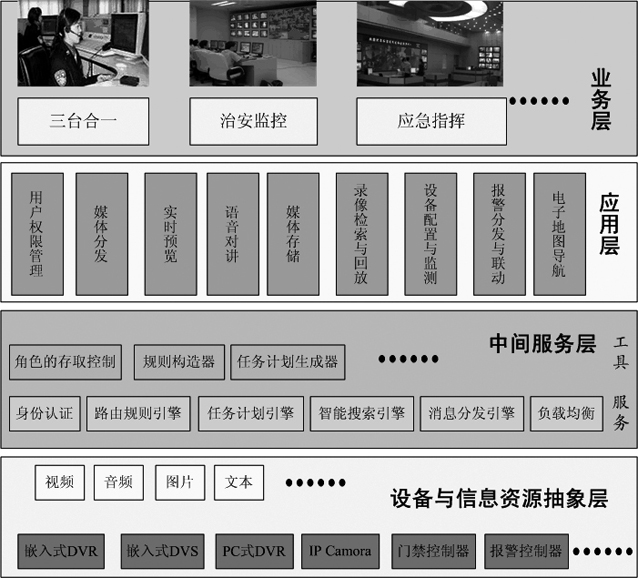 第四層為設(shè)備與信息資源抽象層,實(shí)現(xiàn)了安防設(shè)備和音視頻、圖片和文本等信息的歸納抽象,并接入到平臺(tái)進(jìn)行集成管理,使用戶無(wú)需關(guān)心所使用的設(shè)備和信息資源的具體位置和形態(tài),便于設(shè)備信息資源的組織和調(diào)度,更好的為業(yè)務(wù)服務(wù)。