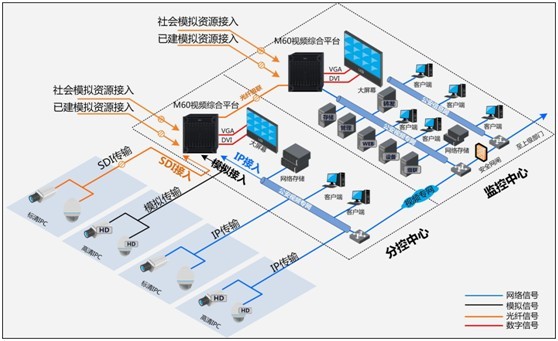 M60視頻綜合平臺,通過對模擬、IP、SDI等多種技術(shù)的接入,實現(xiàn)對平安城市系統(tǒng)中社會監(jiān)控資源、公安IP/SDI高清監(jiān)控資源、公安早期模擬監(jiān)控資源等多種監(jiān)控資源的整合。