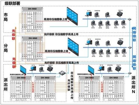 通過光傳輸技術(shù),系統(tǒng)支持光纖級聯(lián),滿足高清非壓縮數(shù)據(jù)對傳輸帶寬的要求,支持多機擴展,滿足不同規(guī)模的需求,可實現(xiàn)從派出所-分局-市局-省廳的多級級聯(lián)管理應(yīng)用。