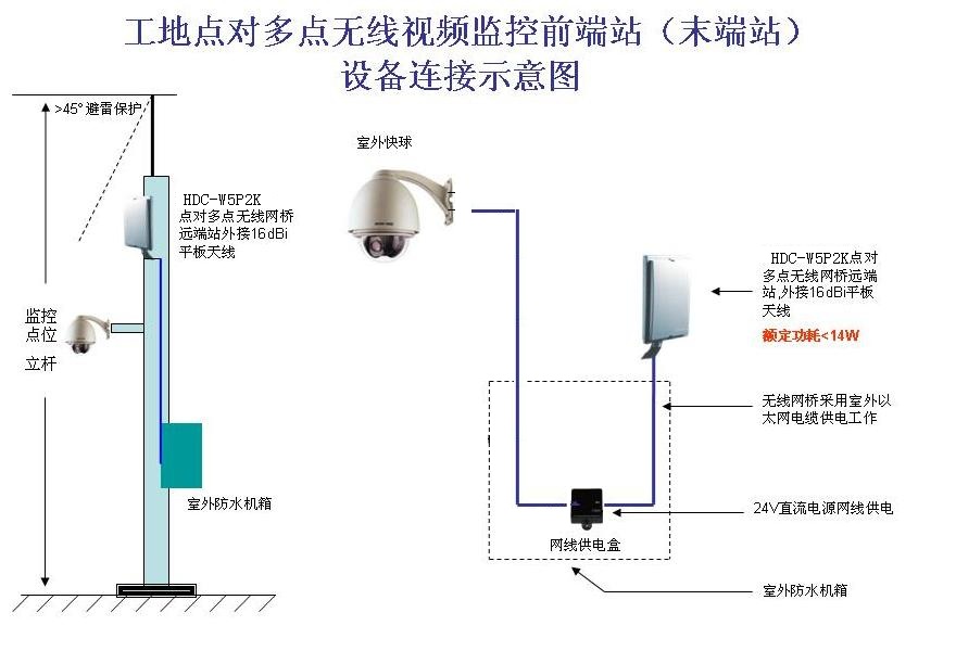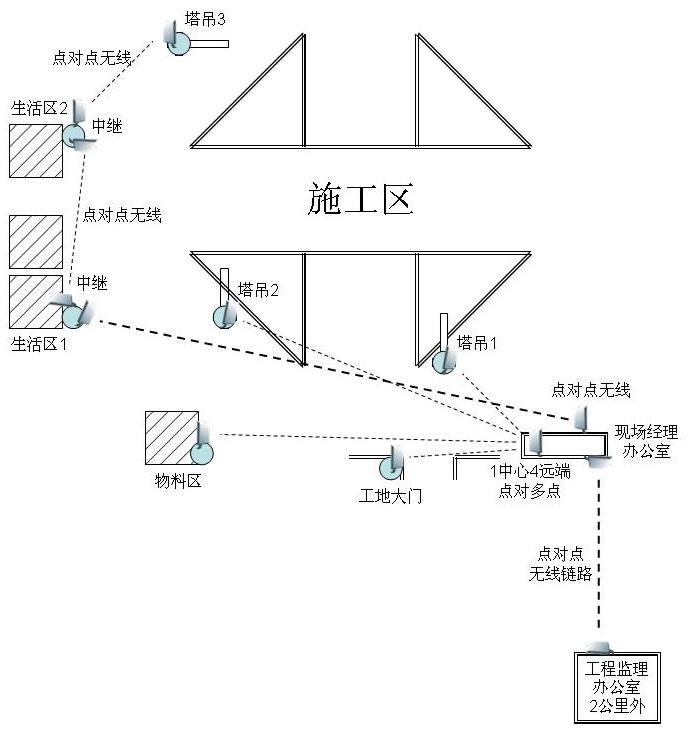 為保證某項(xiàng)目工程安全順利進(jìn)行,公司管理人員能夠及時(shí)了解施工現(xiàn)場(chǎng)情況和施工進(jìn)度,在工程現(xiàn)場(chǎng)安裝了合肥環(huán)宇智能工程有限公司的5.8GHz室外點(diǎn)對(duì)點(diǎn)、點(diǎn)對(duì)多點(diǎn)無(wú)線(xiàn)視頻監(jiān)控系統(tǒng),該系統(tǒng)由合肥監(jiān)控公司環(huán)宇智能的點(diǎn)對(duì)點(diǎn)、點(diǎn)對(duì)多點(diǎn)無(wú)線(xiàn)網(wǎng)橋和200W網(wǎng)絡(luò)高速球組成。
